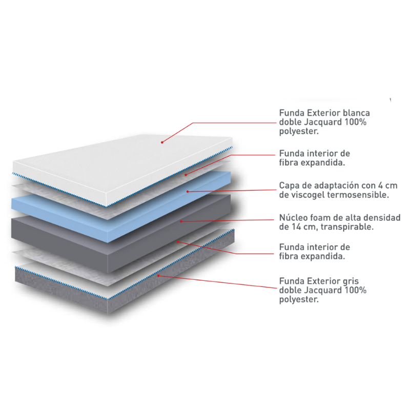 Posee una capa de adaptación con 4 cm de Viscogel termosensible encima del núcleo para un diseño más anatómico y confortable. Núcleo protegido por una funda interior de fibra expandida para proteger sus propiedades de los agentes externos. Funda exterior blanca doble Jaquard 100% poliéster, resistente ante roturas y totalmente transpirable, capaz de soportar altas temperaturas, por lo que lo hace perfecto en climas cálidos.